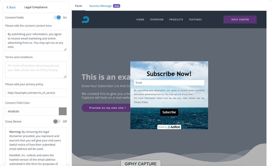 AdRoll makes it easy to add consent to your forms by toggling the consent fields in the legal compliance tab.