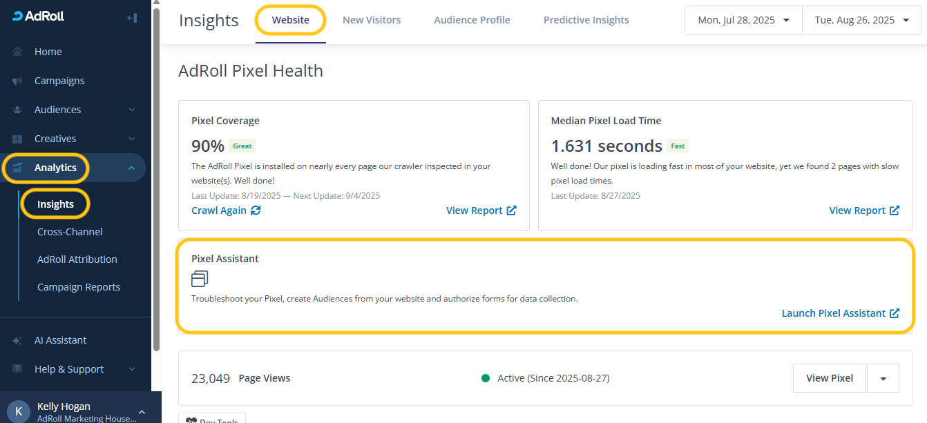 - Log in to AdRoll and navigate to Analytics > Insights on the left side menu.